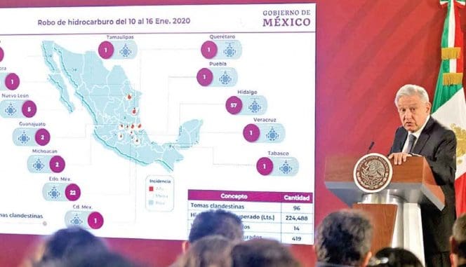 Apuntó que el huachicoleo continúa, principalmente en el estado de Hidalgo, donde en el periodo del 10 al 16 de enero se registraron 57 de las 96 tomas clandestinas del país.