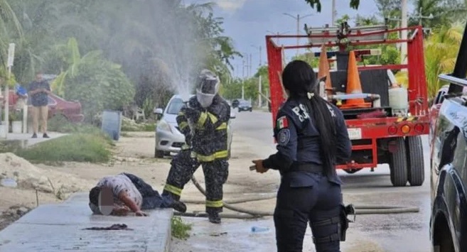 Chetumal, Quintana Roo, 29 de julio del 2023.-Dos personas terminaron en el hospital luego de ser atacadas por un enjambre de abejas en la carretera transversal, evento en el que bomberos, policías y paramédicos también fueron atacados, por lo que se hizo difícil el rescate de las víctimas.