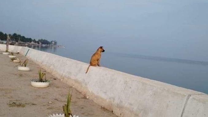 El cachorro aparece sentado sobre un muro de contención, mirando hacía el mar fijamente.