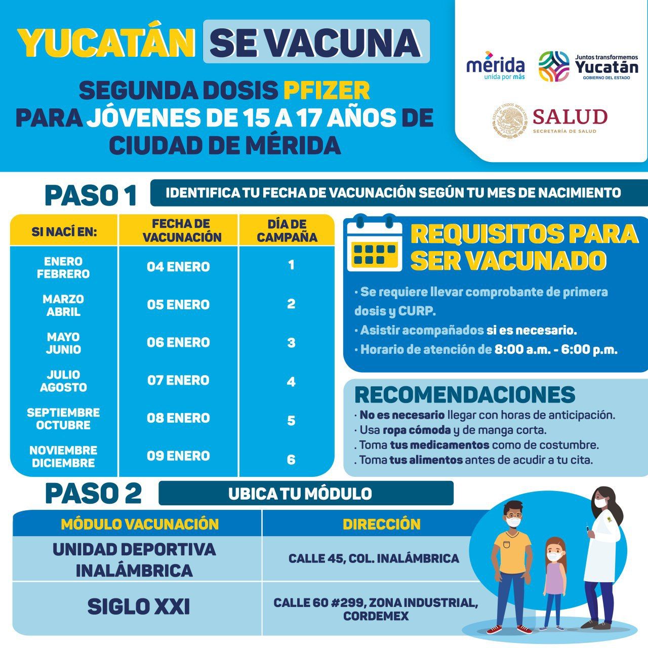 Mérida, Yucatán, 29 de diciembre de 2021.- Adolescentes de 15 a 17 años de edad que viven en Mérida, recibirán la segunda dosis de la vacuna contra el Coronavirus de la farmacéutica Pfizer, del martes 4 al domingo 9 de enero, informaron la Secretaría de Salud estatal (SSY) y la Secretaría de Bienestar.