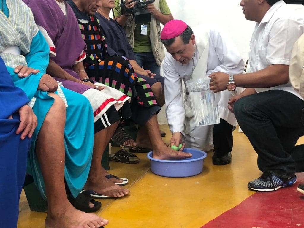 El Arzobispo de Yucatán, Gustavo Rodríguez Vega, lavó los pies a doce reclusos, seis hombres y seis mujeres, del Centro de Centro Reinserción Social (Cereso) de Mérida como parte de los oficios religiosos con motivo de Jueves Santo, donde también acudieron familiares de los internos-