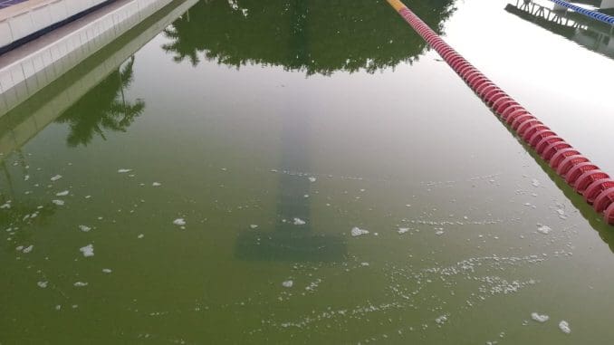 San Fco. Campeche, Campeche, 24 de octubre del 2022.-Usuario denuncia a través de las redes las malas condiciones de la alberca olímpica de la Unidad Deportiva 20 de Noviembre, en las imágenes se puede observar el agua verdosa y sucia.