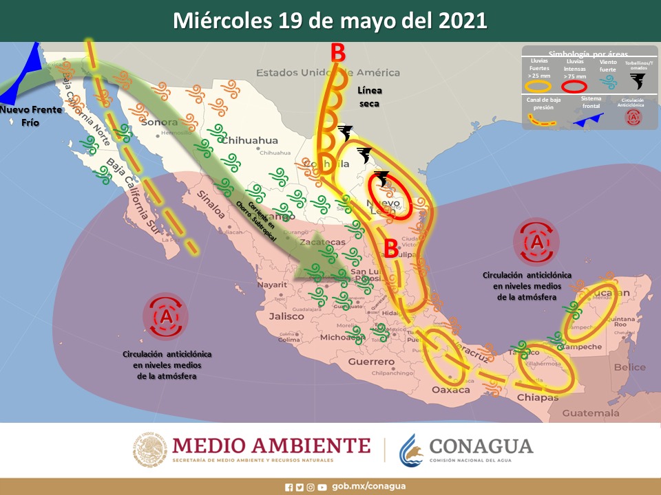 Para este miércoles, el SMN indica que continuará el ambiente de caluroso a muy caluroso con cielo medio nublado y con la posibilidad de potencial de ocurrencia de lluvias para la zona este, sureste y centro del estado y vientos del este y sureste