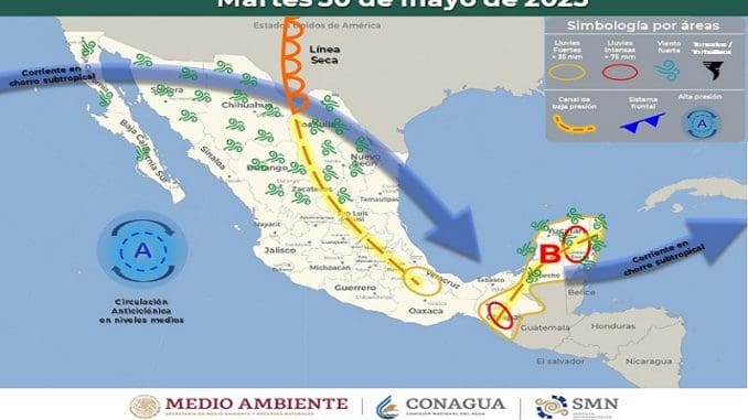 El SMN precisó que las precipitaciones se deben a la presencia de canales de baja presión, que se ubican sobre las mesas del Norte y Central, así como en el oriente del país y la Península de Yucatán.