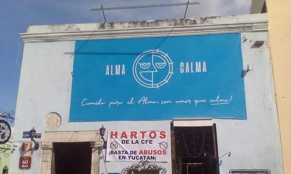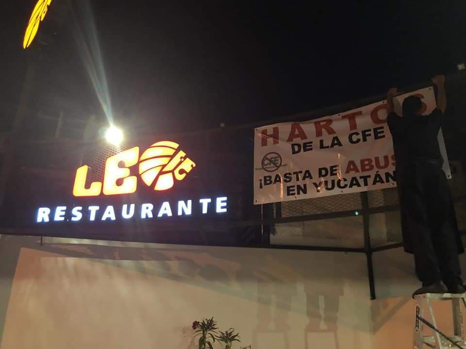 Mérida, Yucatán, 12 de noviembre de 2018.– Previo a que se realice el apagón convocado por empresarios como medida de protesta contra las altas tarifas impuestas por al Comisión Federal de Electricidad (CFE), varios restaurantes ya lucen pancartas expresando su descontento hacia la paraestatal.