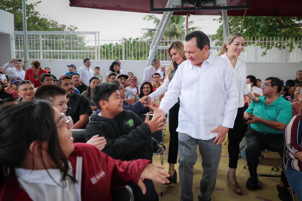 Por su parte, la alumna de quinto grado Abril Elizabeth Calderón Tun recordó que, antes de la rehabilitación, ella y sus compañeras y compañeros tomaban clases en espacios reducidos y realizaban Educación Física en un parque cercano expuestos al sol.