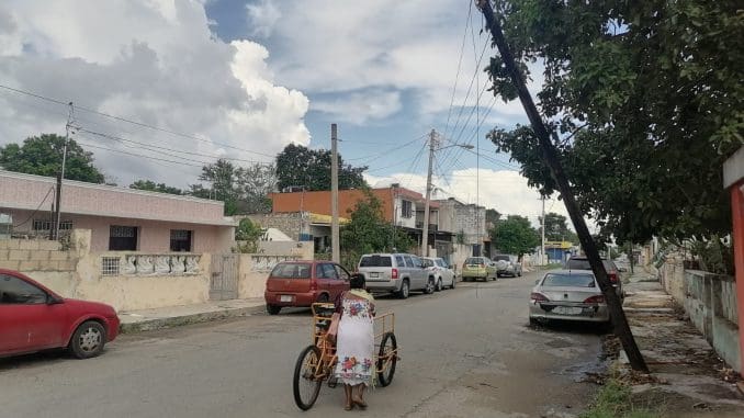 Este poste de teléfono inclinado representa un peligro constante para quien pasa por el rumbo de la calle 14 x 63C de la colonia Cortés Sarmiento, como esta señora de la tercera edad que transita con su triciclo. Vecinos dijeron que han llamado a la empresa responsable pero aún no reemplaza el poste.