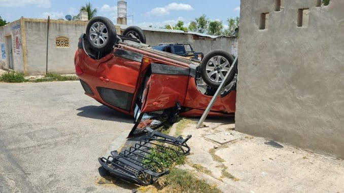 Mérida, Yucatán, 6 de junio del 2023.- Aparatosa volcadura se registró este medio día en calles del fraccionamiento San José Tecoh, al sur de la ciudad de Mérida, la guiadora de una camioneta Eco Sport se pasó la señal de alto y fue impactada por el conductor de un Honda Civic. Por suerte no se reportaron Lesionados.