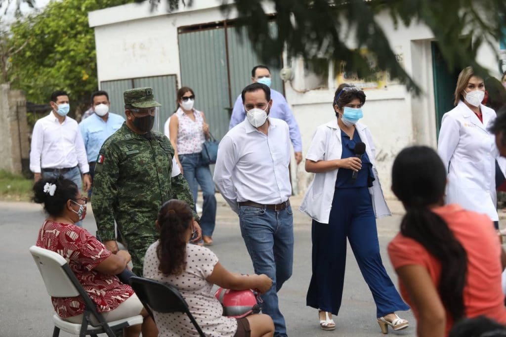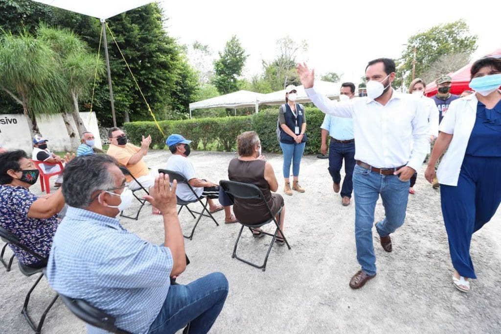 Acompañado del Comandante de la 32 Zona Militar, General de Brigada Francisco Miguel Aranda Gutiérrez, y de la delegada del Instituto Mexicano del Seguro Social (IMSS) en Yucatán, Miriam Sánchez Castro, Vila Dosal acudió a la Unidad Médica Familiar del IMSS de este municipio para constatar la segunda jornada de aplicación de vacunas a la población adulta mayor de esta demarcación. En Tixkokob se están administrando más 2,600 dosis.