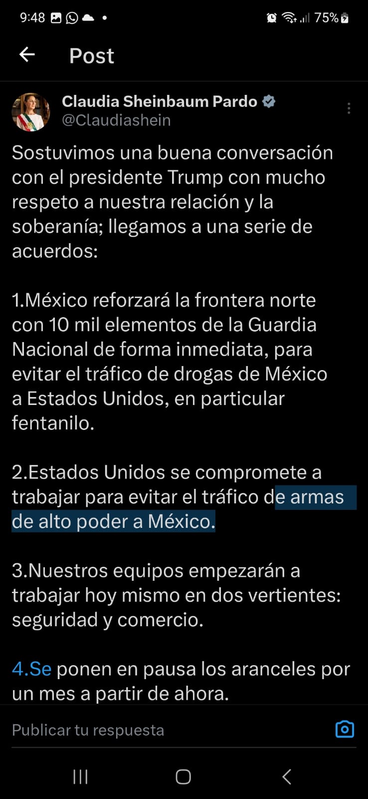 Sheinbaum Pardo dijo que entre otros acuerdos quedaron que México reforzará la frontera norte con 10 mil elementos de la Guardia Nacional de forma inmediata, para evitar el tráfico de drogas de México a Estados Unidos, en particular fentanilo. Mientras que el país vecino se comprometió a trabajar para evitar el tráfico de armas de alto poder a México.