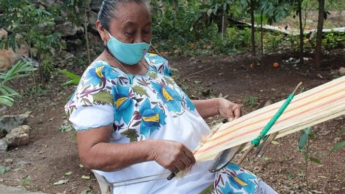 Hocabá, Yucatán, 17 de enero de 2021.- Todos los días, Paula Maas Cab, de 67 años de edad hace un espacio dentro de sus labores en el hogar para reunirse con sus recuerdos frente al telar de cintura y elaborar piezas con fibra de henequén. Esta actividad que comparte con otras artesanas de Hocabá le ha permitido exponer en el Museo de Arte Popular de Yucatán (MAPY).