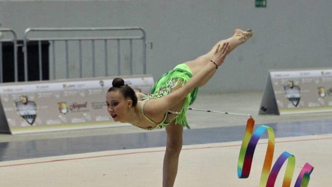 Las preseas doradas las obtuvo en los aparatos de Pelota con puntuación 29.150, en Clavas con puntaje de 27.600, y en Cinta con 27.500 puntos; así como un metal dorado más en All Around, luego de una gran exhibición en todas sus rutinas por aparato.