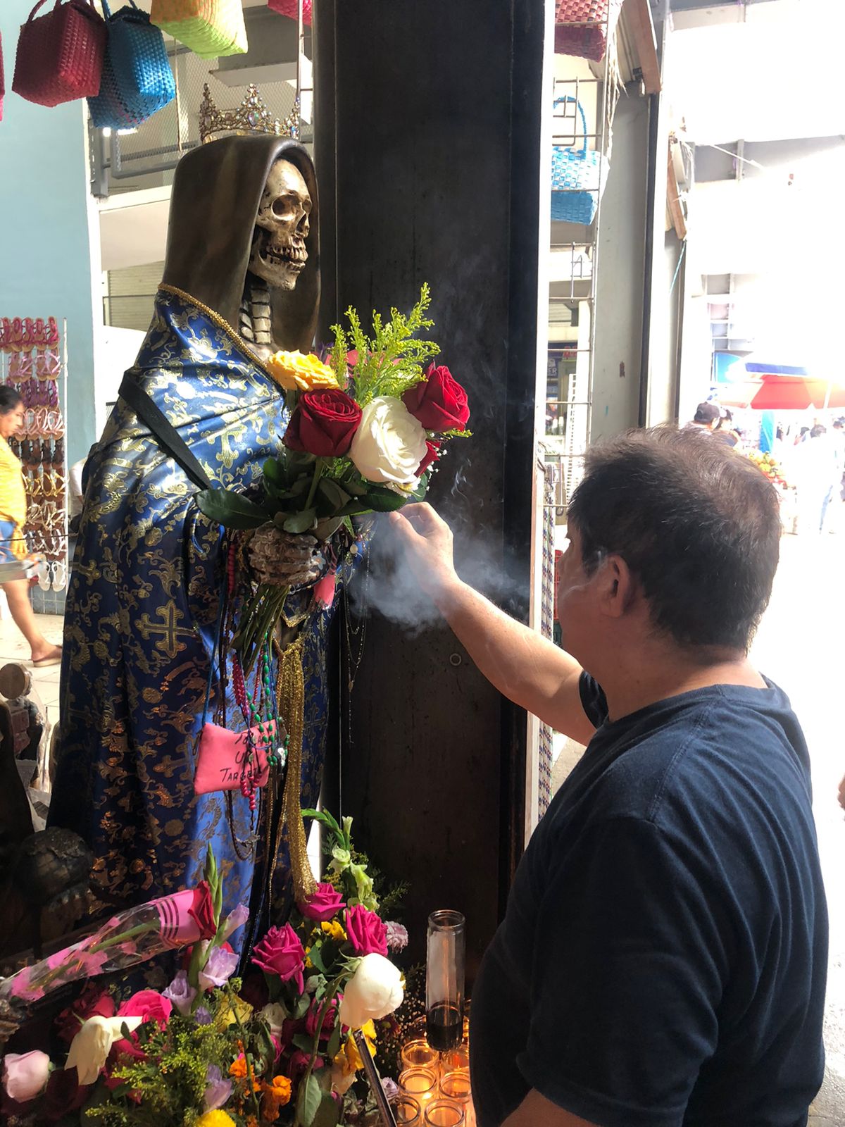 Al interior del mercado “Lucas de Gálvez” se encuentra un altar dedicado a la Santa Muerte y donde personas acuden a ofrecerle sus respetos y a pedirle salud y dinero, principalmente.
