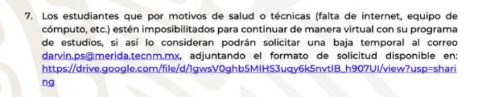Hizo referencia al comunicado que se publicó en días pasados, en donde el ITM sugirió a las y los estudiantes darse de baja, en caso que no puedan tomar las clases en línea por motivos de salud o técnicos.