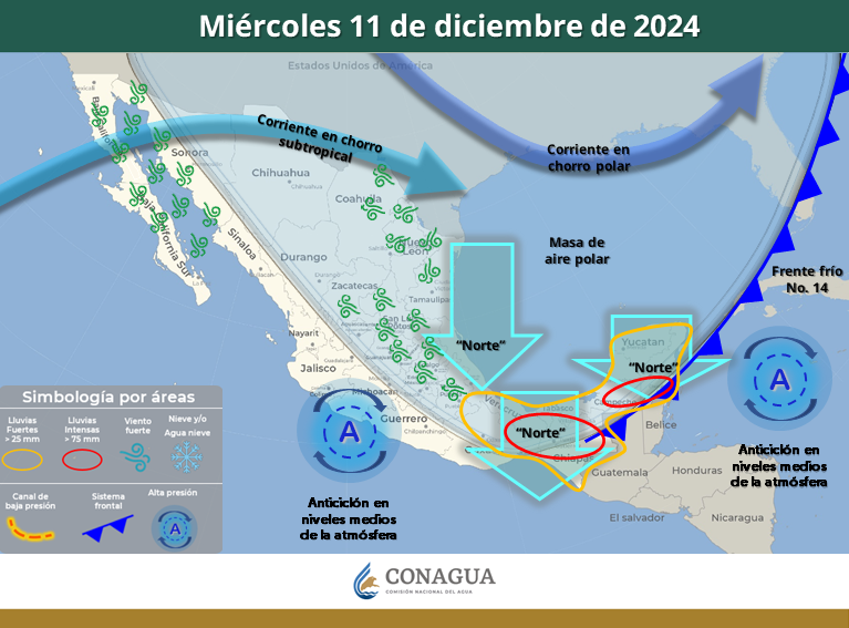 Mérida, a 11 de diciembre de 2024.- La unidad de Protección Civil de Yucatán (Procivy) informó que el frente frío No. 14 avanza hacia la Península de Yucatán, por lo cual se espera que sjus efectos comenzarán a sentirse entre las  9 y 12 del día de este miércoles.