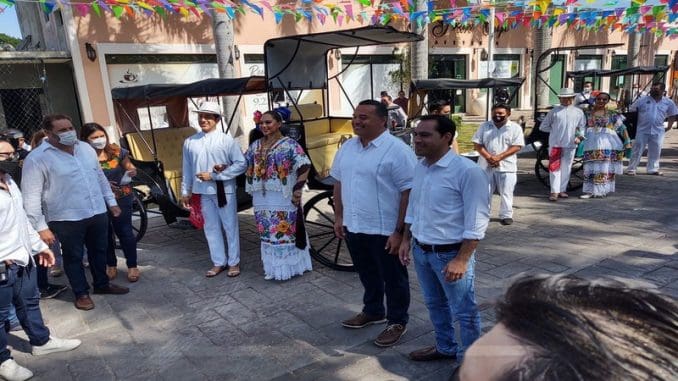 Mérida, Yucatán, 8 de julio de 2022.- El alcalde de Mérida, Renan Barrera Concha, y el gobernador del Estado, Mauricio Vila Dosal, dieron el banderazo de arranque de las primeras seis calesas eléctricas.