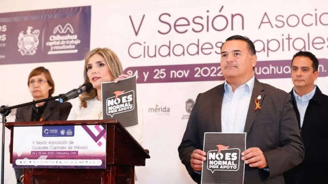 Al cierre de la rueda de prensa, la Alcaldesa de Colima, Margarita Moreno González, junto con los alcaldes presentes, sostuvieron los carteles de la campaña “No es Normal, Pide Apoyo” como parte de la campaña que desarrollan en su Municipio como parte del Día Internacional de la Eliminación de la Violencia contra la Mujer.