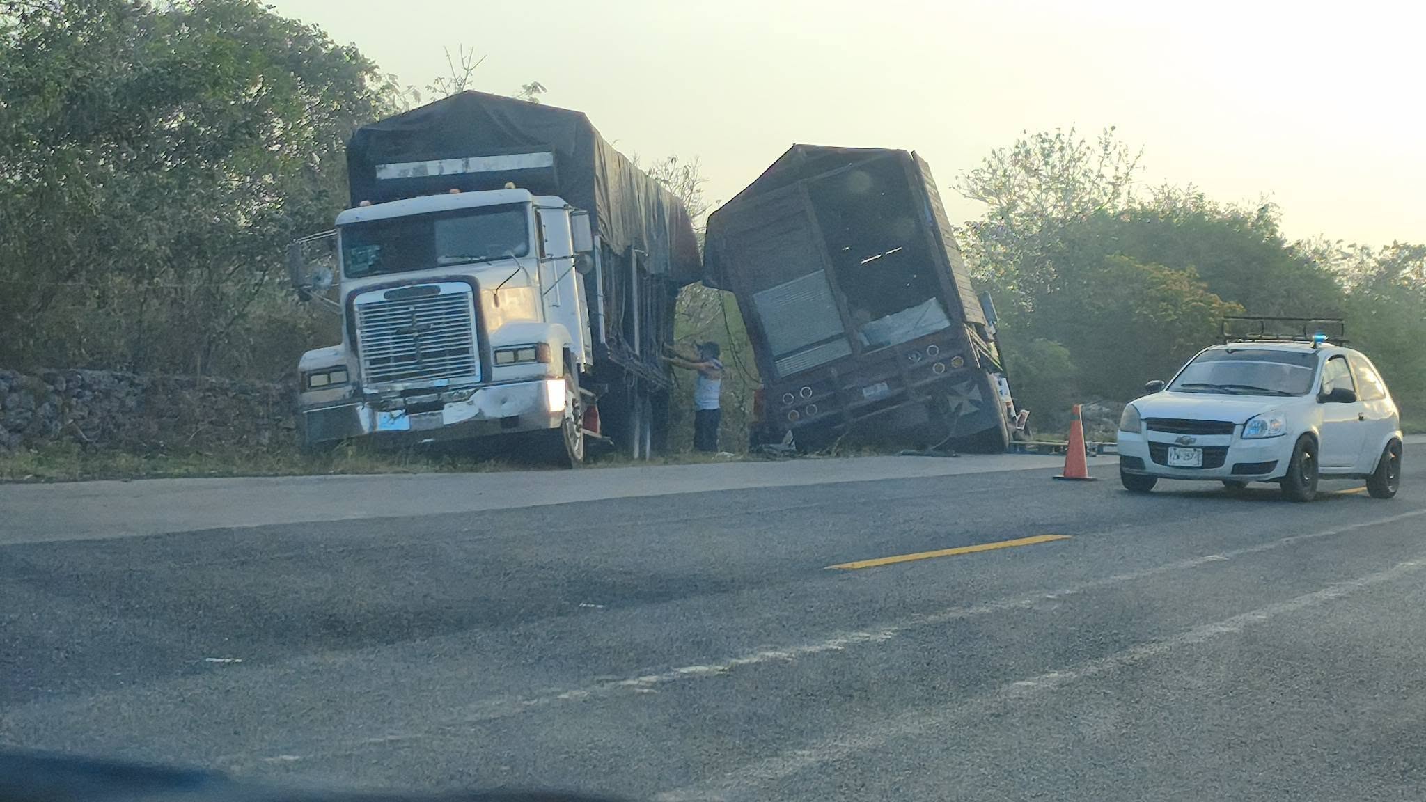 Elementos de la Policía Municipal de Cansahcab acudieron para abanderar la zona y exhortar a los automovilistas a extremar precauciones, ya que parte del camión quedó invadiendo el carril con dirección al citado municipio.