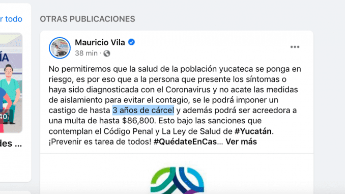 Mérida, Yucatán, 29 de marzo de 2020.- A través de Facebook el gobernador Mauricio Vila Dosal aseguró que no pondrá en riesgo a la población; por ello una persona contagiada que no acate las medidas podría ser sancionada hasta con tres años de prisíon.