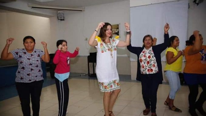 La presidenta del PAN, Cecilia Patrón Laviada, muestra cómo se debe bailar la jarana en el Comité Directivo Municipal del partido blanquiazul donde se imparten clases de este tradicional baile yucateco.