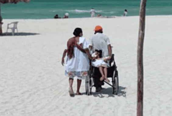 Abuelitos llevaron a su nieta en silla de ruedas a la orilla de la playa. En la imagen se ve como ambos llevan la silla entre la arena para acercar a la pequeña a contemplar las olas y la brisa. Una imagen que a miles de internautas conmovió en redes sociales