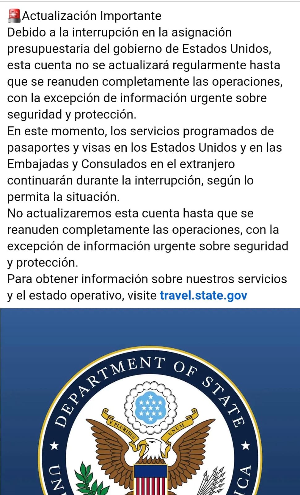 “En este momento, los servicios programados de pasaportes y visas en los Estados Unidos y en las Embajadas y Consulados en el extranjero continuarán durante la interrupción, según lo permita la situación”, notificó el Consulado General de Estados Unidos en Mérida.