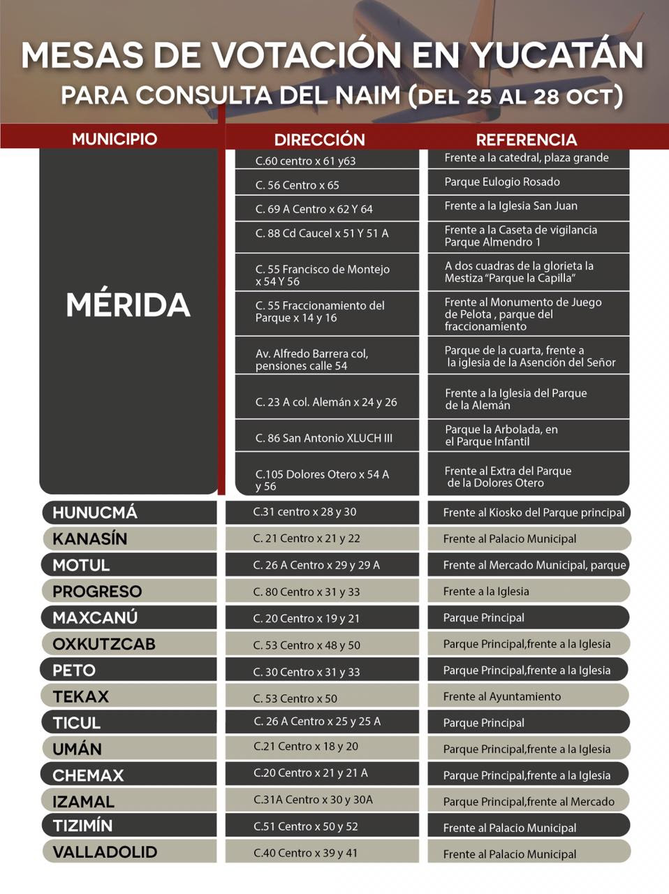 Las mesas de consulta en nuestro estado estarán ubicadas de la siguiente manera, 10 en la ciudad de Mérida, cubriendo las zonas centro, sur, norte, oriente y poniente.