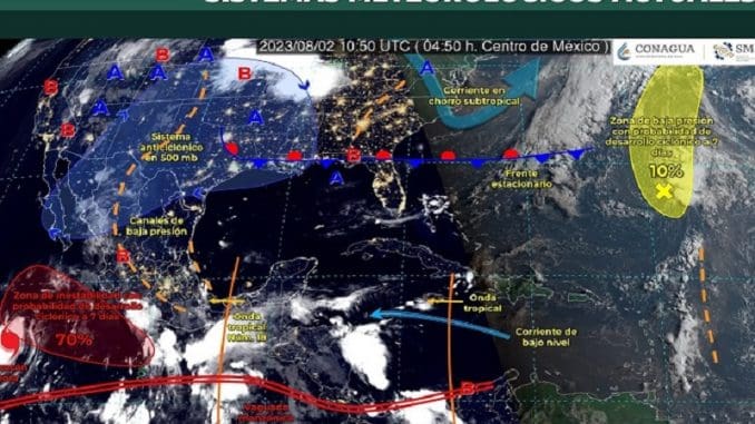 Aunque los pronósticos han fallado y no cayeron las lluvias que se anticiparon, la Conagua indica que el jueves y el viernes habría chubascos con lluvias fuertes, mientras que el sábado se esperan sólo chubascos. En esos tres días las temperaturas máximas serían de 35 a 40º C.