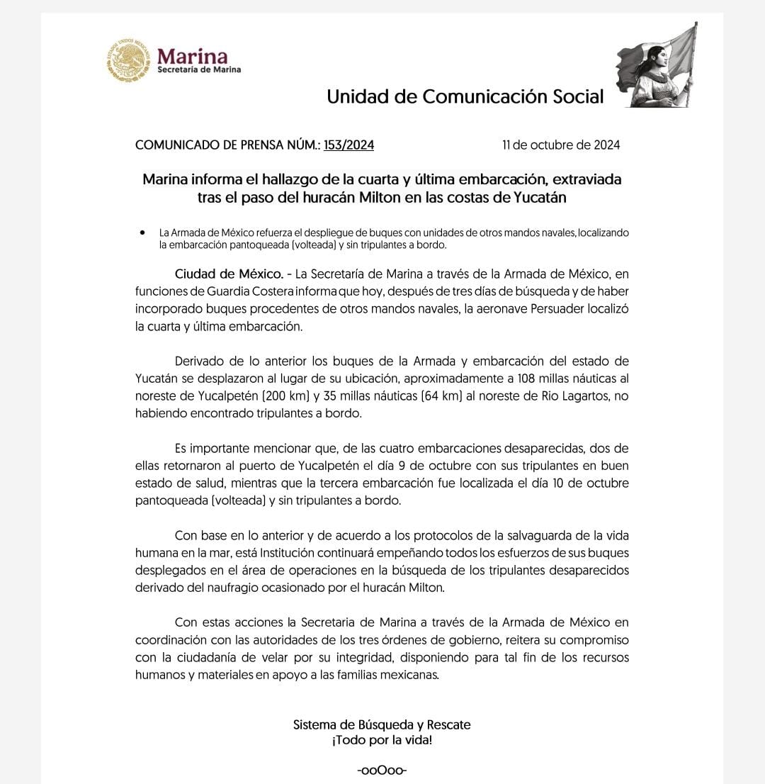 “De acuerdo a los protocolos de la salvaguarda de la vida humana en la mar, se continuará empeñando todos los esfuerzos de buques desplegados en el área de operaciones en la búsqueda de los tripulantes desaparecidos, derivado del huracán Milton”, señala el comunicado.