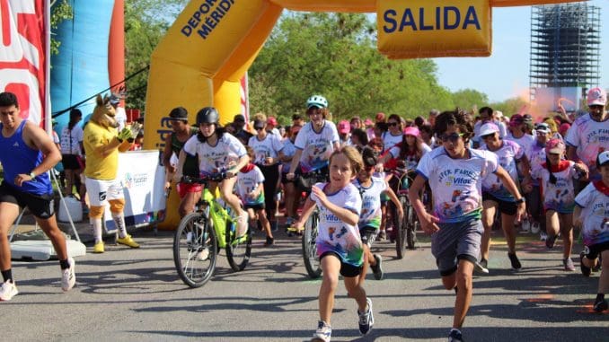 Niños y familias completas se dieron cita en Super Aki San Angelo, donde Melba Abraham Achach, presidenta de Vifac; Jesús Aguilar y Aguilar, secretario Técnico de Deportes del Ayuntamiento de Mérida; y Carlos Sáenz Castillo, director del Instituto del Deporte de Yucatán, dieron los disparos de salida de la carrera y caminata recreativa del evento lleno de color durante los cinco kilómetros.