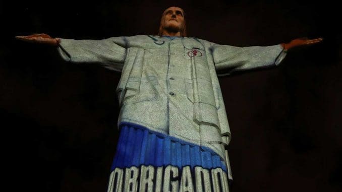 Río de Janeiro, Brasil, 13 de abril del 2020.- La colosal estatua del Cristo Redentor se ‘vistió’ de médico para honrar a los trabajadores de salud que luchan alrededor del mundo contra el nuevo coronavirus.