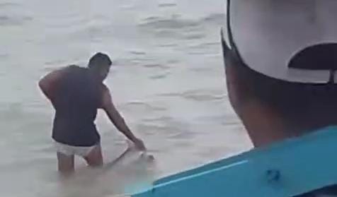 Este sujeto, al parecer turista nacional, generó críticas pues en el video que se difundió en redes sociales se le observa en una zona de baja profundidad, intentando capturar al ejemplar.