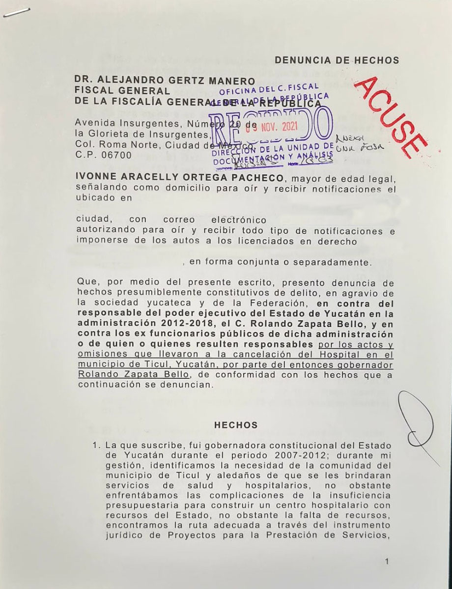 Ciudad de México, 3 de noviembre del 2021.- Tal como anunció en días pasados, Ivonne Ortega Pacheco presentó hoy formal denuncia en contra de Rolando Zapata Bello, ex funcionarios públicos de la administración 2012-2018 y quien o quienes resulten responsables por actos y omisiones que llevaron a la cancelación del hospital de Ticul.
