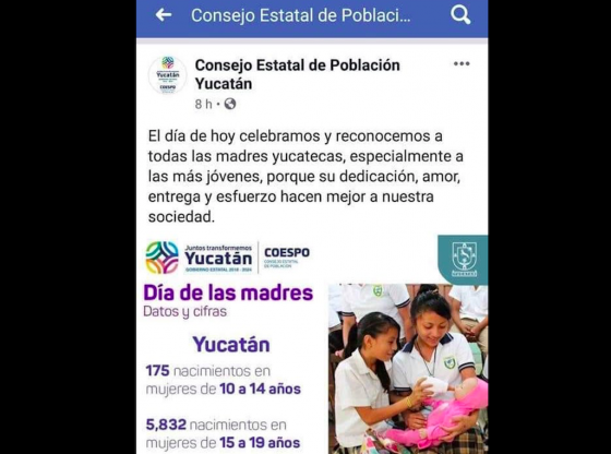 Mérida, Yucatán, 11 de mayo de 2019.- Aunque las cifras señalan que una de las principales causas de maternidad entre adolescentes y niñas es la violación sexual, el Consejo Estatal de Población (COESPO) publicó a través de Facebook una felicitación a las mujeres que son madres a edad temprana.