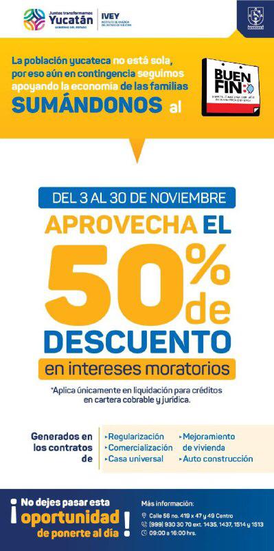 El Instituto de Vivienda del Estado (IVEY), del 3 al 30 de este mes, descontará 50 por ciento en intereses moratorios, que se aplica únicamente en liquidación de créditos en cartera cobrable y jurídica, generados en contratos de regularización, comercialización, mejoramiento, autoconstrucción y casa universal.