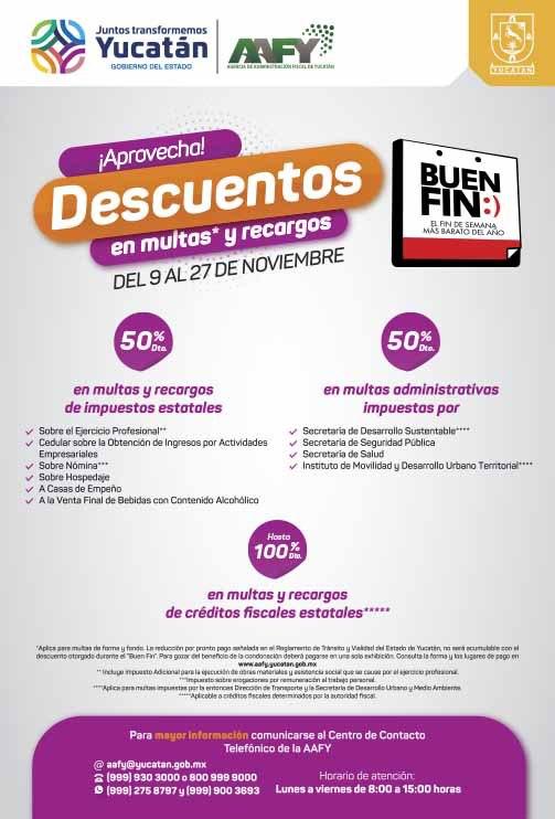 También, con la misma tasa, en multas administrativas impuestas por las Secretarías de Desarrollo Sustentable (SDS), Seguridad Pública (SSP) y de Salud (SSY), o el Instituto de Movilidad y Desarrollo Urbano Territorial (Imdut), y otra hasta del 100 por ciento en multas y recargos de créditos fiscales. Se puede contactar al correo aafy@yucatan.gob.mx, a los teléfonos (999) 930 3000 y 800 999 9000, o por WhatsApp al (999) 275 8797 y (999) 900 3693.