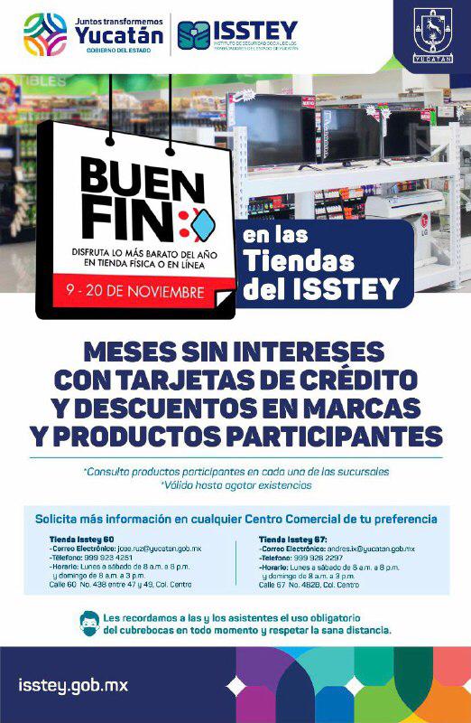 Las Tiendas del Instituto de Seguridad Social de los Trabajadores del Estado (Isstey) brindarán meses sin intereses con tarjetas participantes, y rebajas en ciertas marcas o productos; se ubican en el 438 de la 60 por 47 y 49, y en el 482B de la 67, también del Centro, con horarios de lunes a sábados de 8:00 a 20:00 y domingos de 8:00 a 15:00.