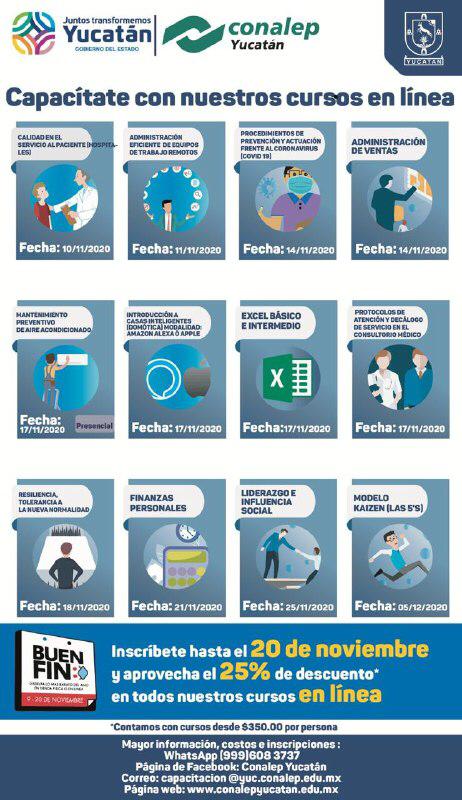 De igual manera, el Colegio Nacional de Educación Profesional Técnica (Conalep) impartirá cursos de capacitación en línea, abiertos a empresas, instituciones y población en general, con descuentos del 25 por ciento. Para inscribirse o solicitar más datos, están disponibles el WhatsApp (999) 608 3737 y el correo capacitacion@yuc.conalep.edu.mx.