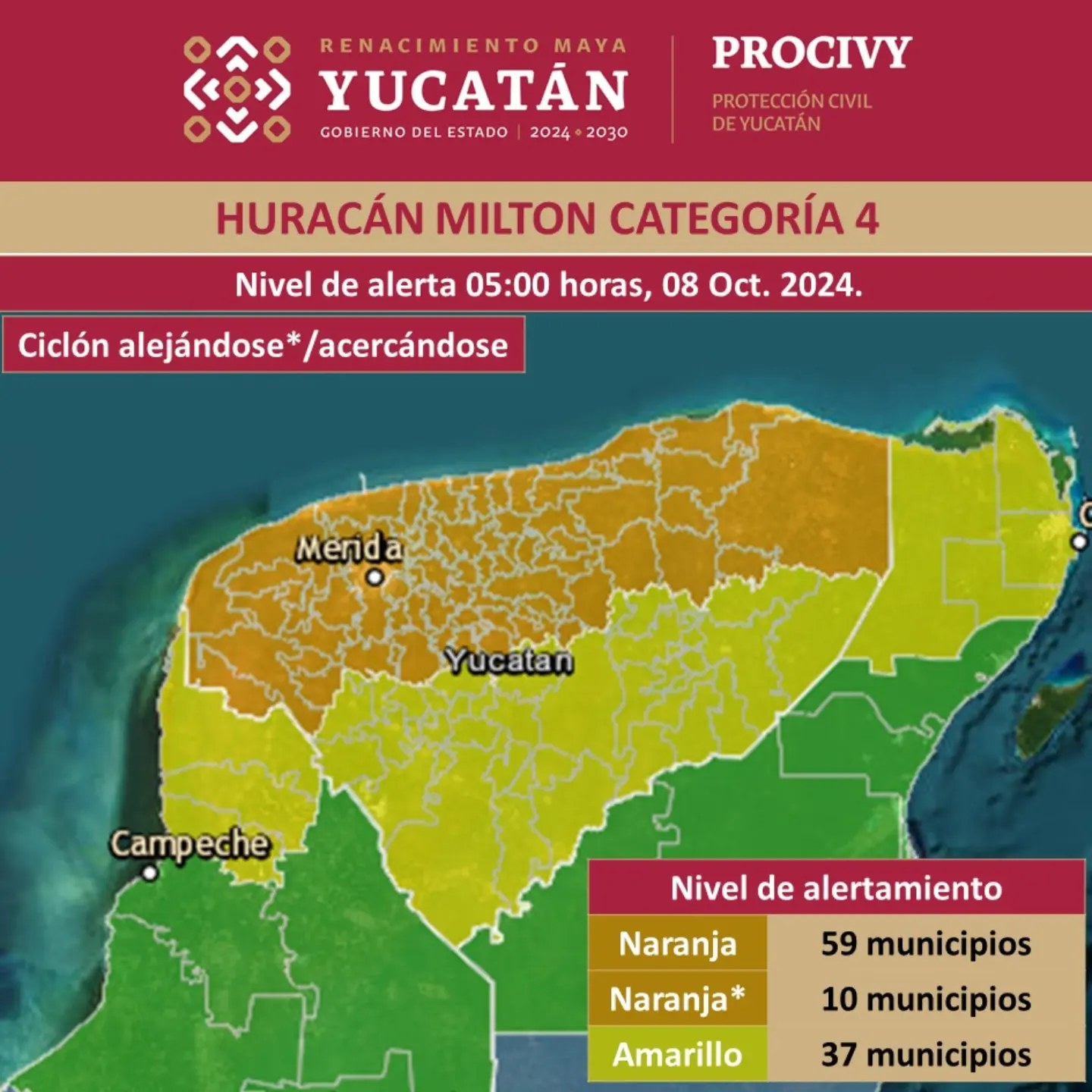Mérida, a 8 de octubre de 2024.- Protección Civil de Yucatán desactivó la Alerta Roja por Milton, no obstante 59 municipios mantienen Alerta Naranja por acercamiento de huracán, otros 10 por alejamiento.
