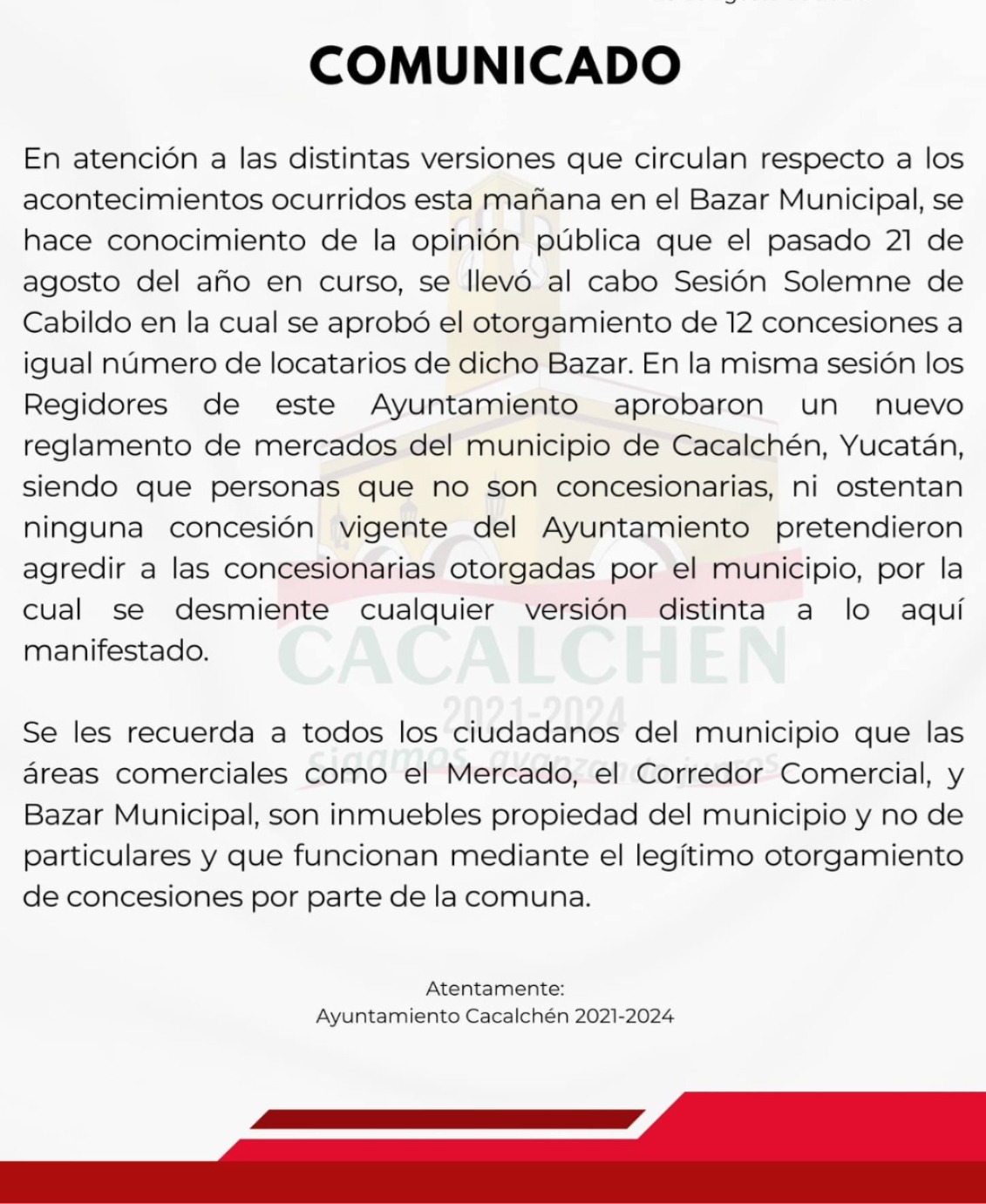 A través de redes sociales, el Ayuntamiento de Cacalchén publicó un comunicado luego de lo acontecido, en el que puntualizó que el pasado 21 de agosto se realizó una sesión solemne del Cabildo para aprobar 12 concesiones al mismo número de locatarios de dicho bazar, al igual que se aprobaron nuevos reglamentos.