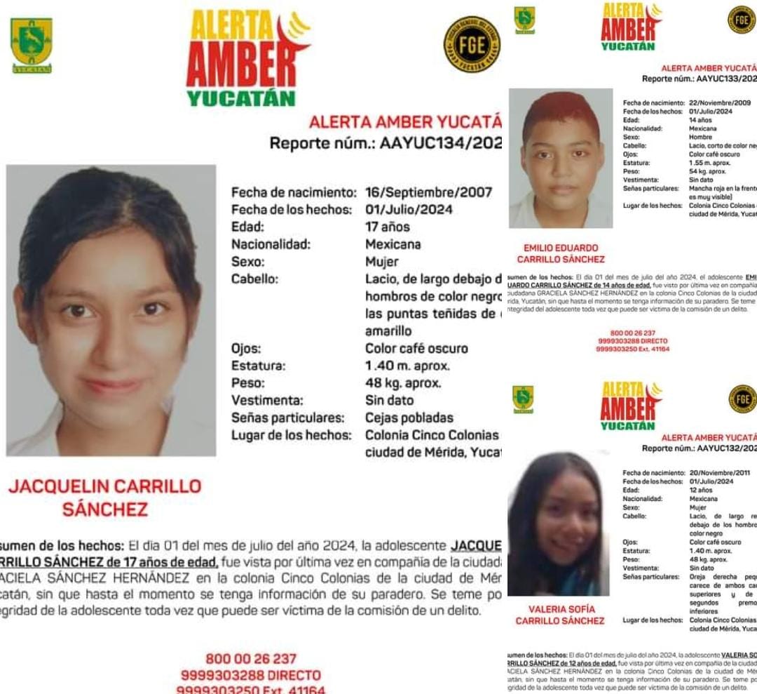 Mérida, a 4 de julio de 2024.- Tres hermanos de 12, 14 y 17 años de edad, fueron reportados como desaparecidos en la colonia Cinco Colonias en el sur de Mérida