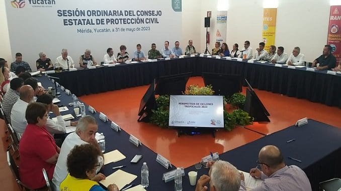 Mérida, Yucatán, a 2 de junio de 2023.- En la primera Sesión Ordinaria 2023 del Consejo Estatal de Protección Civil, en el arranque de la temporada de huracanes en el Océano Atlántico, las autoridades estatales, municipales y federales se declaran listas ante la amenaza de cualquier contingencia meteorológica.