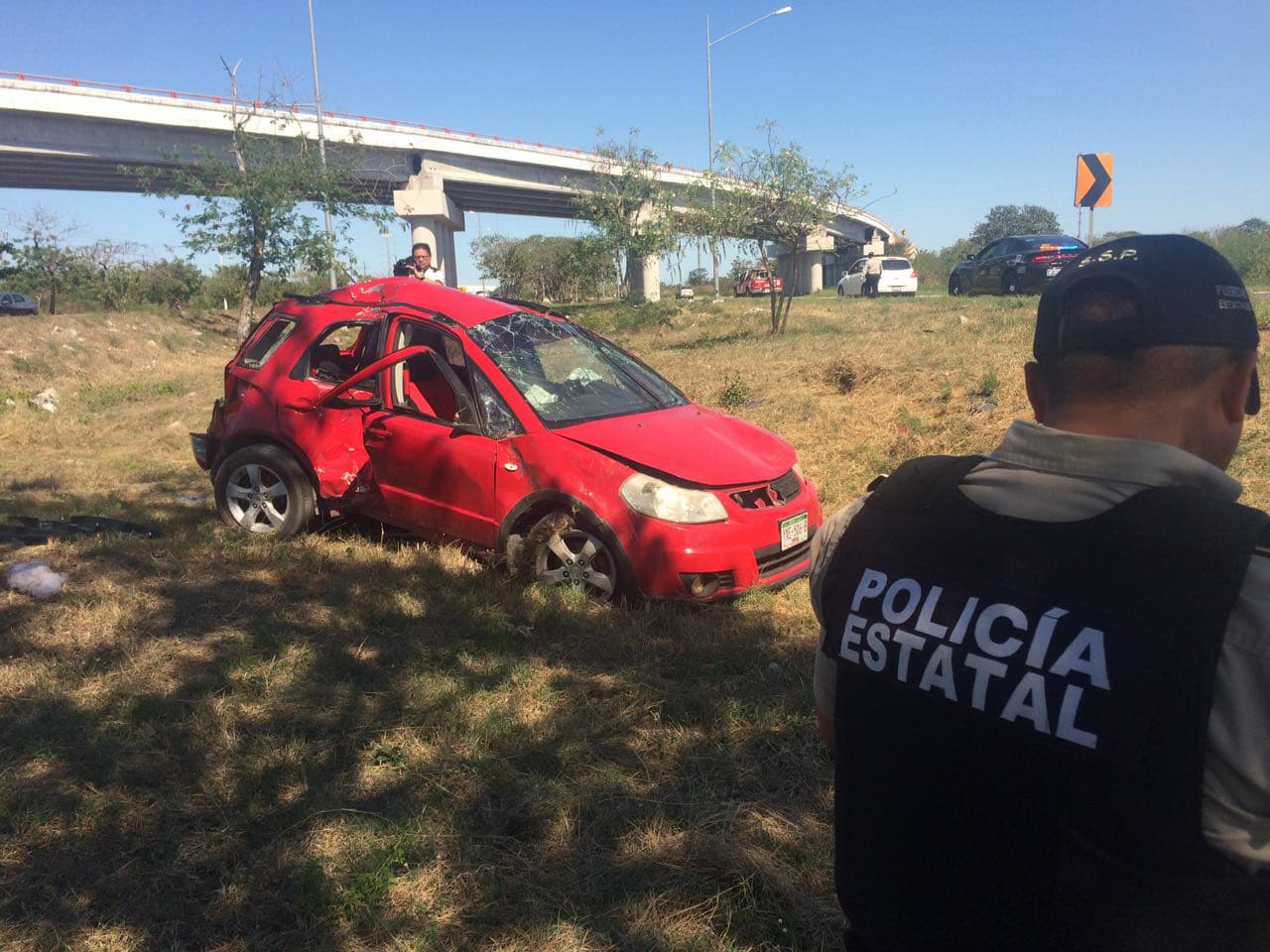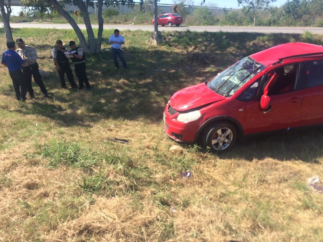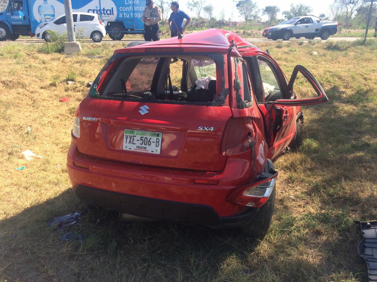 Tras el impacto, el automóvil marca Suzuki de color rojo se volcó en la hondonada, y quedó recostado sobre su parte izquierda.