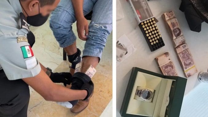 Mérida, Yucatán, 19 de agosto de 2021.– En medio del huracán Grace, la Guardia Nacional ubicó a un pasajero que llevaba adheridos a los tobillos y en su mochila alrededor de 450 mil pesos mexicanos.