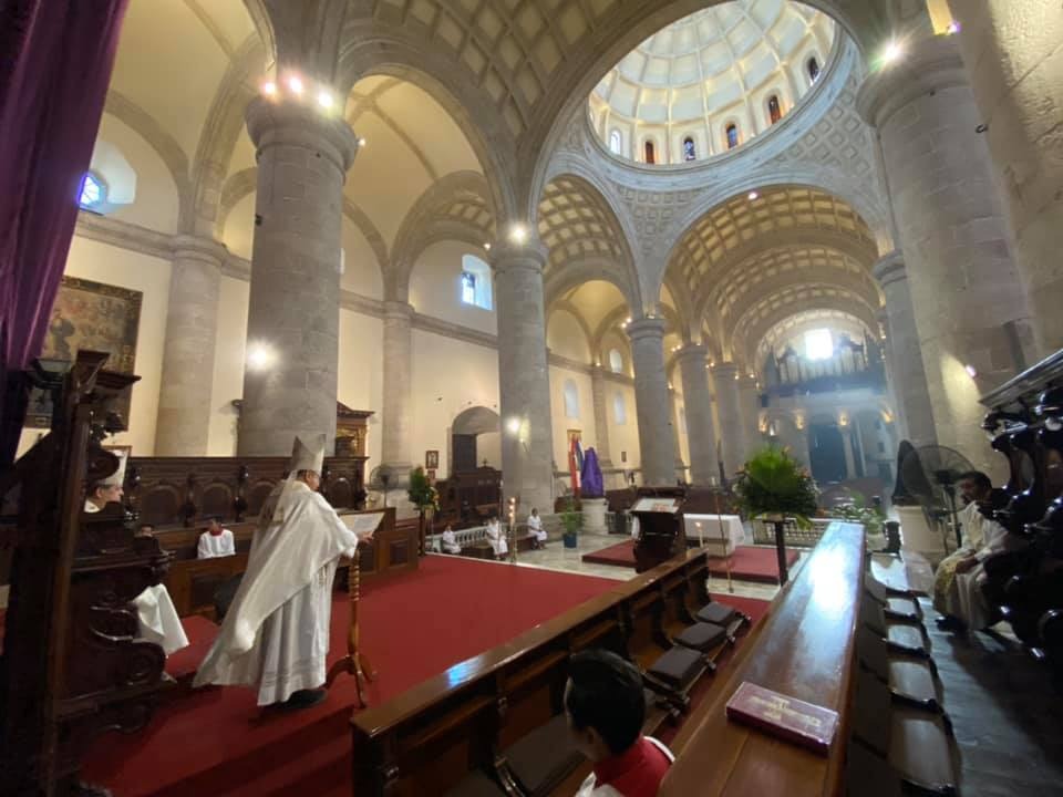 Mérida, Yucatán, 10 de abril de 2020.- En un hecho histórico, los católicos de Yucatán siguieron a través de las redes sociales la celebración del Jueves Santo, la cual fue celebrada a puerta cerrada en la Catedral por el Arzobispo de Yucatán, Gustavo Rodríguez Vega, y el Obispo Auxiliar, Pedro Mena Díaz, quienes pidieron a los fieles vivir en familia la Semana Santa.