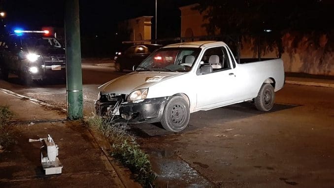 Mérida, Yucatán, 24 de febrero de 2021.– Un conductor ebrio no se detuvo hasta que un poste se le ‘cruzó’ en el camino en calles del fraccionamiento Ciudad Caucel de esta capital yucateca.
