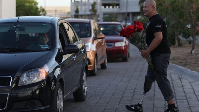 Dicen que la peor discapacidad es el miedo, y definitivamente este hombre no lo tiene. Vende flores todas las tardes en los cruces de las avenidas para sacar el sustento diario.