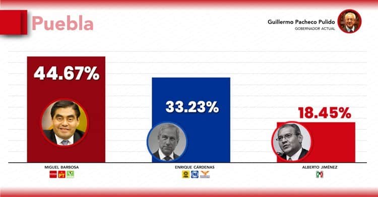 En Puebla, en la votación por partido y con el 100 por ciento del PREP completado, el candidato panista, Enrique Cárdenas, ganó 414 mil 356 votos, contra los 390 mil 805 sufragios de Morena para Miguel Barbosa; sin embargo, obtuvo la gubernatura por los votos de sus aliados, 163 mil 044 del PT y 128 mil 396 del PVEM.