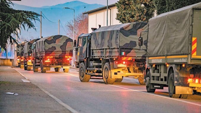 Bérgamo, Italia, 20 de marzo del 2020.- Una de las imágenes más dramáticas de la desastrosa epidemia por coronavirus fue el desfile por el centro de Bérgamo de la caravana de camiones del ejército que transportaron 65 féretros con los muertos que deben ser llevados a crematorios de otras regiones italianas.