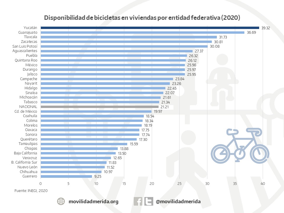 Este dato equivale a que el 39.3% de los domicilios yucatecos dispone de bicicletas, ubicando a la entidad en el primer lugar a nivel nacional.